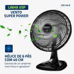 O Ventilador de Mesa Mondial Super Power VSP-40-B possui 40 cm de diâmetro e hélice com 6 pás, garantindo um ambiente mais fresco e agradável. Seu design aerodinâmico, aliado à potência, promove uma circulação de ar mais eficiente.