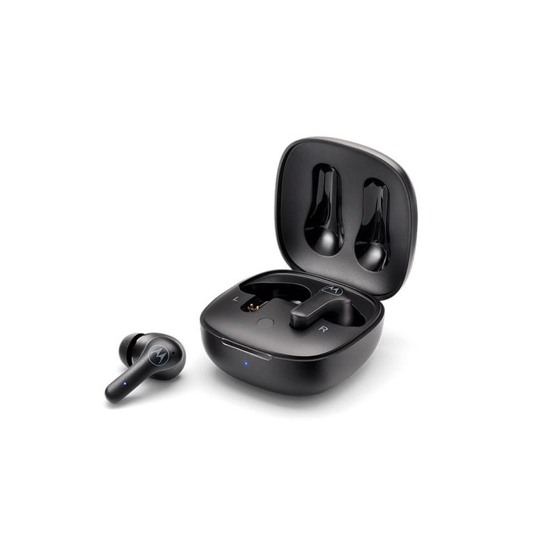 O Moto Buds 135 possui um design ergonômico leve, vendido com um estojo de carregamento compacto e portátil que cabe no bolso para você transportar para qualquer lugar a qualquer momento.