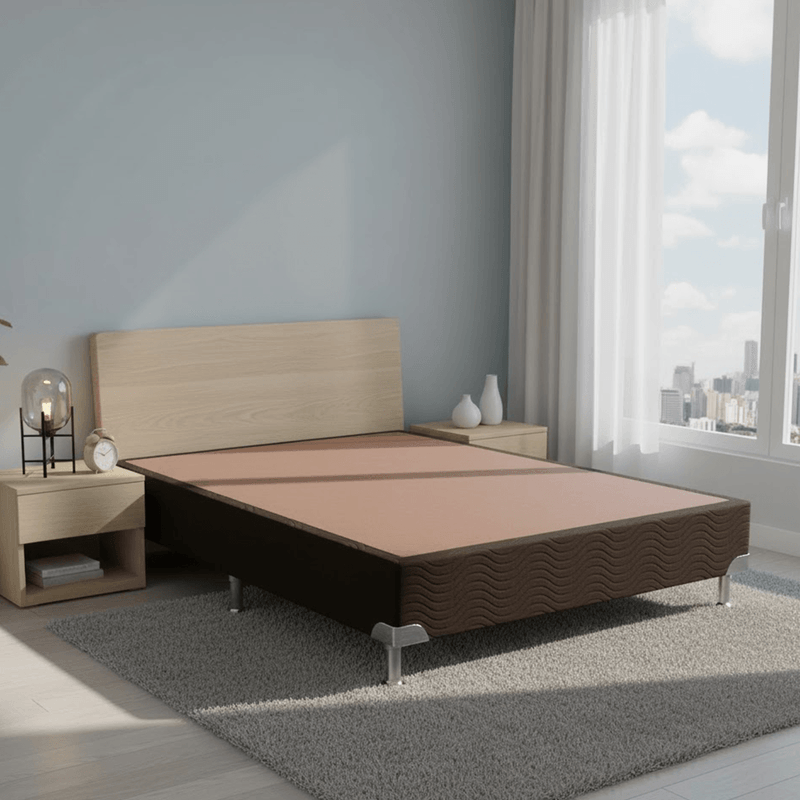 A base de cama acompanha um jogo de pés em PVC, proporcionando fácil instalação e estabilidade, além de ser ideal para suportar os colchões Ortobom, oferecendo maior conforto e suporte.