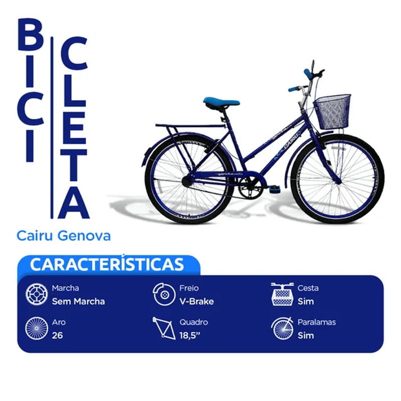Simples, bonita e pronta para o seu estilo de vida. A Cairu Genova Aro 26 é a escolha perfeita para quem busca mobilidade, lazer e um toque de elegância em cada pedalada.
