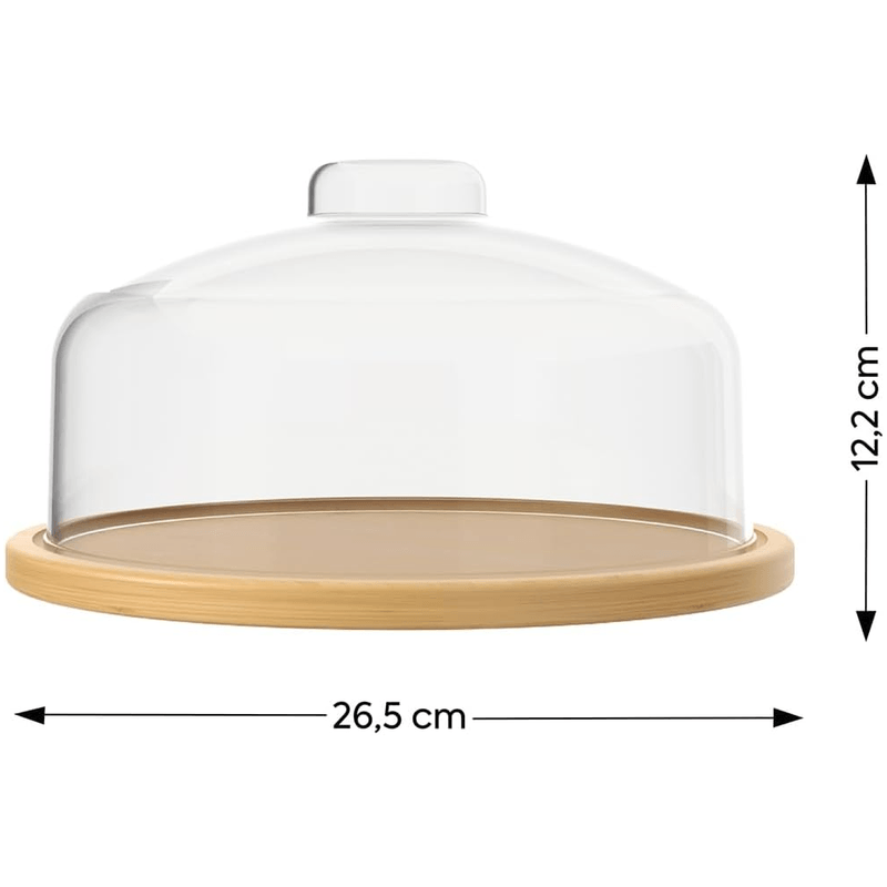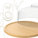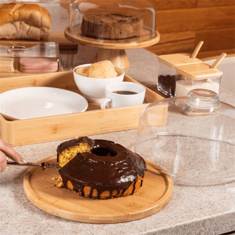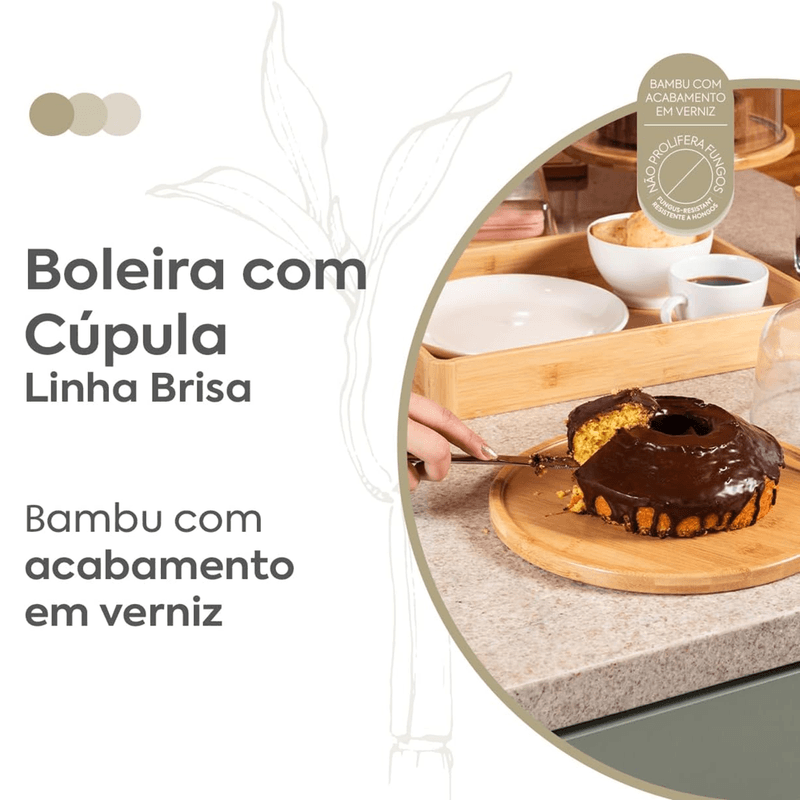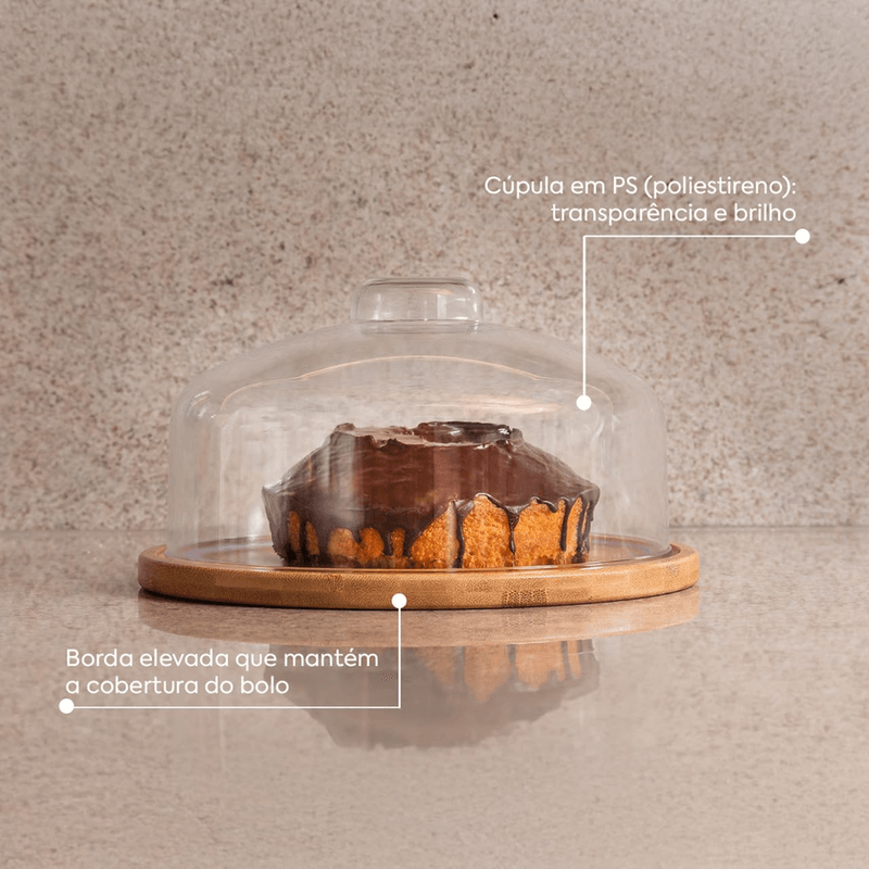 A Boleira Prato Brisa Coza une design sofisticado e sustentabilidade para valorizar a apresentação de bolos, tortas e pães. Com prato em bambu natural e cúpula transparente, oferece proteção ao alimento sem perder a elegância à mesa.