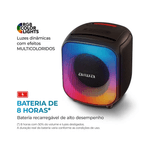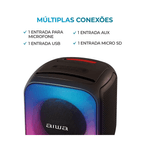 - Conectividade Bluetooth 5.3, entrada auxiliar, USB Tipo C, Micro SD e entrada para microfone