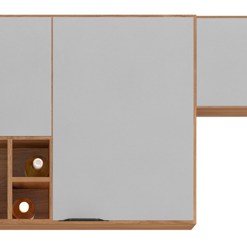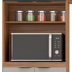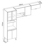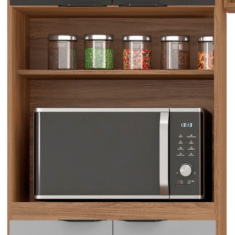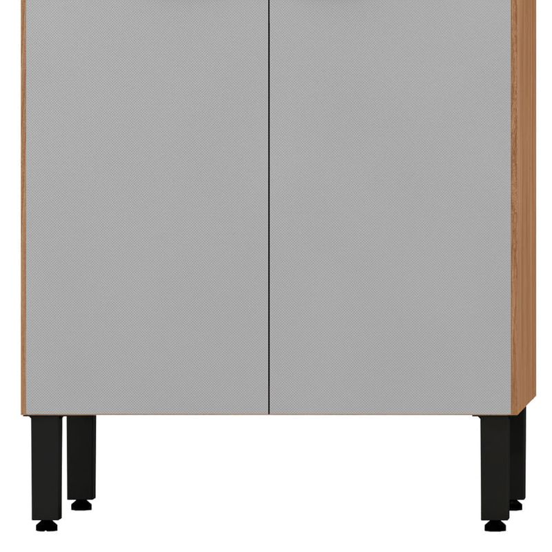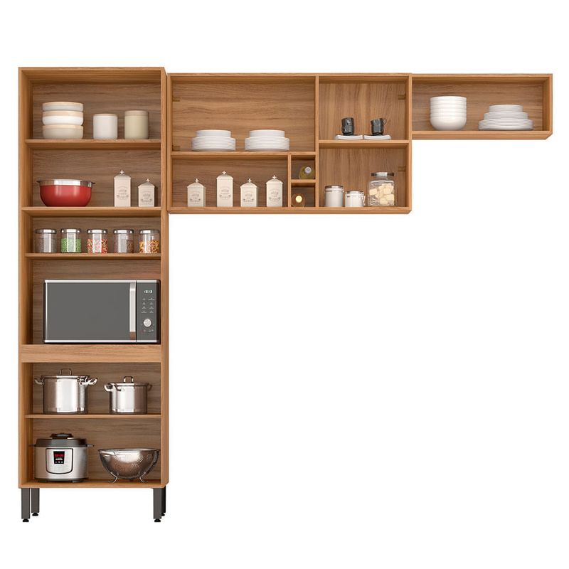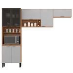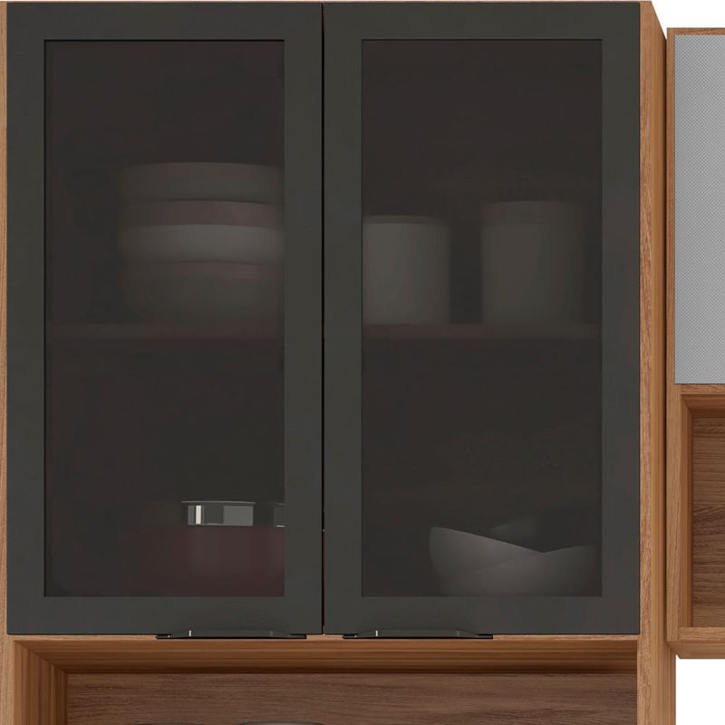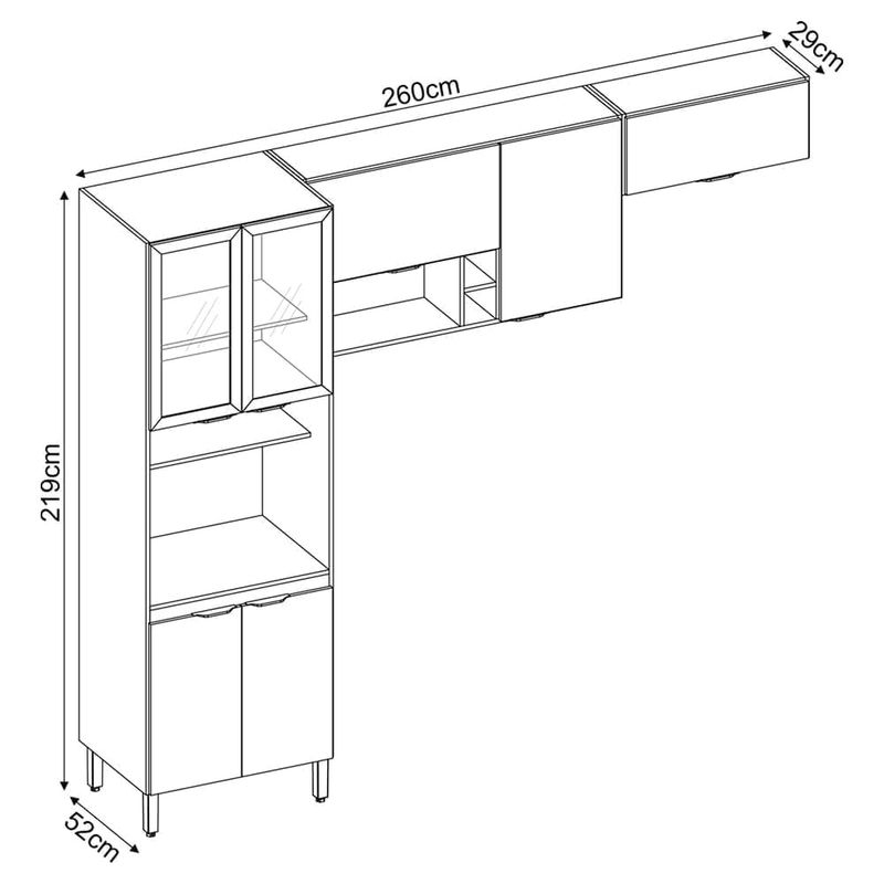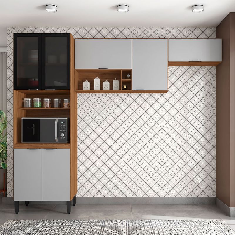 A Cozinha Modulada Firenze tem estrutura em MDP e revestimento em pintura UV. Portas de giro com dobradiças metálicas e prateleiras internas. Porta basculante com pistão a gás. Portas de giro com vidro fumê. Gavetas com corrediças telescópicas. Puxadores em plástico ABS.