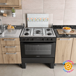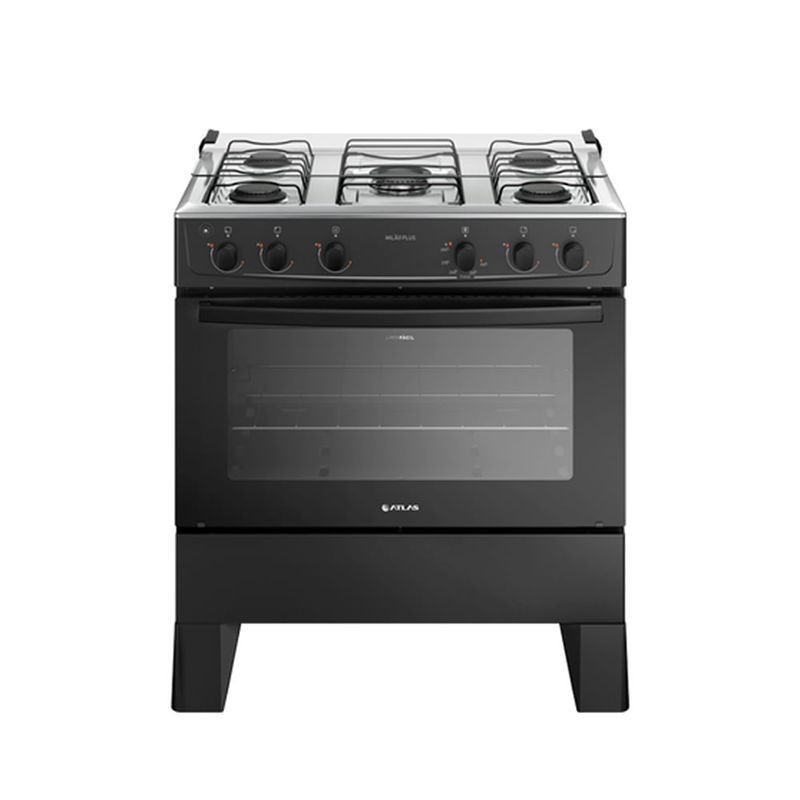 O Fogão 5 Bocas Atlas Preto Milão Plus transforma o visual da sua cozinha com um design moderno e sofisticado. O acabamento em preto profundo confere elegância intemporal ao ambiente, enquanto a mesa em aço inox cria um contraste marcante que valoriza o espaço. Esta combinação refinada se adapta harmoniosamente tanto a ambientes minimalistas contemporâneos quanto a decorações mais clássicas, funcionando como um elemento de destaque que eleva o padrão estético de toda a cozinha.