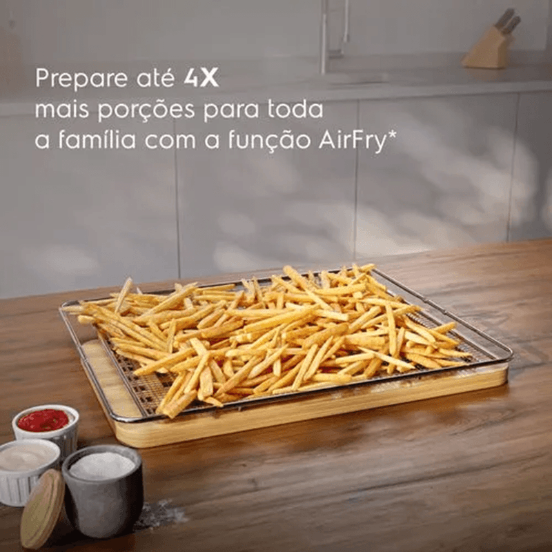 - Função AirFry: mais saúde e sabor — prepara porções crocantes com até 70% menos gordura