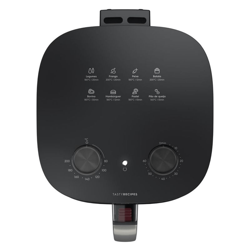 - Painel com 8 receitas pré-programadas: frango, peixe, batata, pão de queijo, pastel, hambúrguer, carne bovina e legumes.