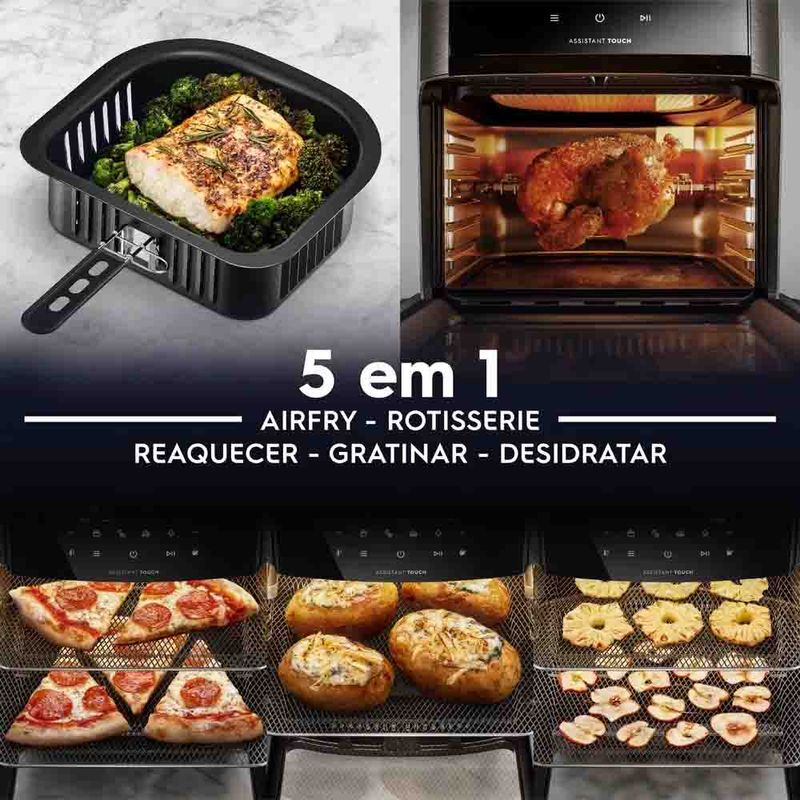 Função Rotisserie: A função rotisserie com espeto giratório garante que frangos, legumes e carnes sejam assados de maneira uniforme, proporcionando um resultado delicioso.