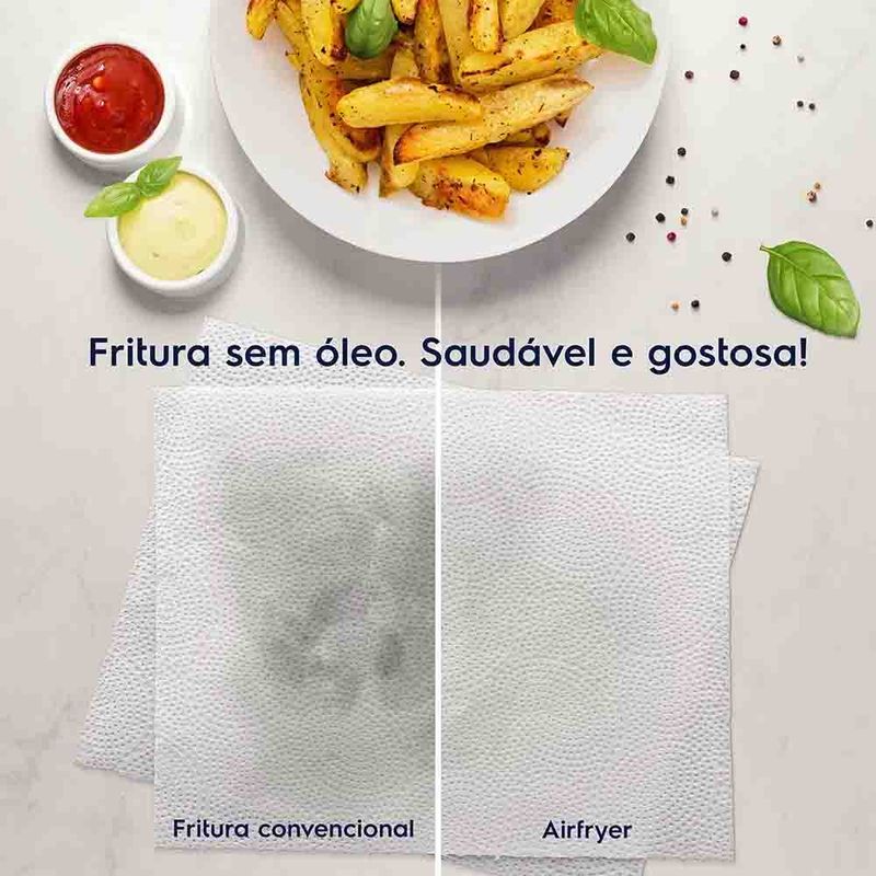 - Redução de Gordura e Calorias: Prepare alimentos com até 90% menos gordura e quase 50% menos calorias, comparado à fritura tradicional com óleo.
