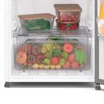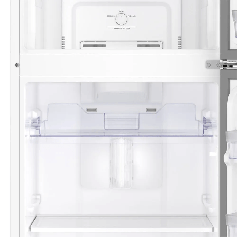 Possui 3 prateleiras de vidro temperado e 1 gaveta no refrigerador, 2 prateleiras no freezer, bandeja para ovos (12 unidades) e forma de gelo (30 cubos). A iluminação de LED permite visualizar facilmente todos os itens.