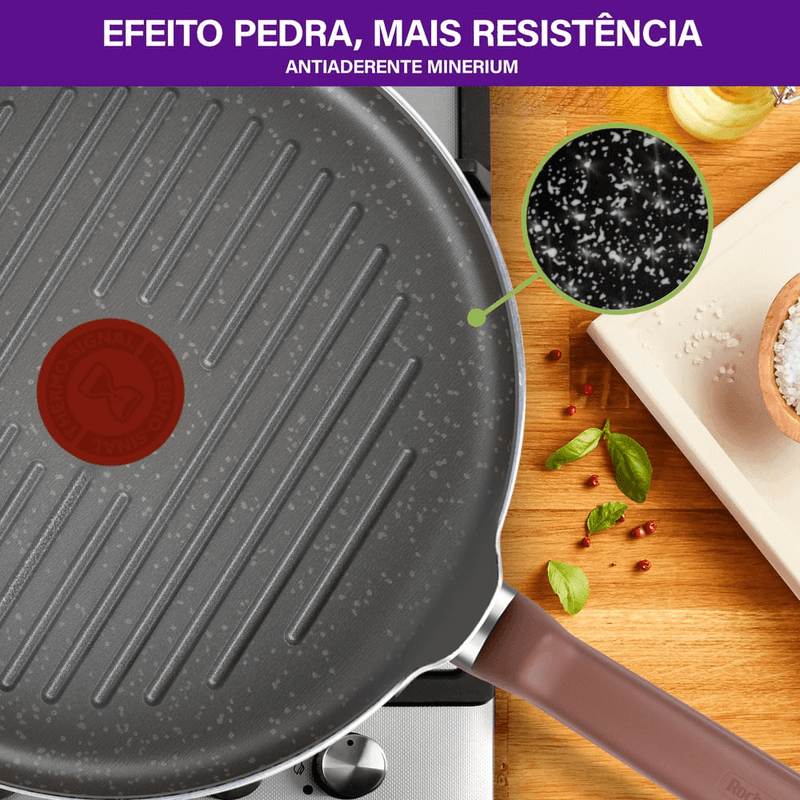 Produto livre de substâncias tóxicas (PFOA); ideal para grelhar sem óleo; compatível com fogões a gás, vitrocerâmicos e elétricos.
