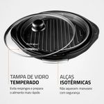 - Saída de Vapor: A tampa de vidro temperado colabora com a preparação mais rápida dos alimentos e evita respingos. Além disso, o vidro temperado possui maior durabilidade.