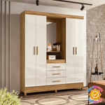 O Guarda-Roupa Capelinha Moval Capri 4 Portas e 3 Gavetas apresenta a clássica e sempre elegante configuração em estilo capelinha, que remete à nobreza do mobiliário tradicional enquanto incorpora elementos contemporâneos. A combinação harmoniosa dos tons Freijo e Off White cria um contraste suave e sofisticado que se adapta perfeitamente a diversos estilos decorativos, desde o clássico renovado até o contemporâneo clean. O espelho centralmente posicionado adiciona funcionalidade ao mesmo tempo que amplia visualmente o ambiente, criando uma sensação de espaço expandido mesmo em quartos de dimensões moderadas.