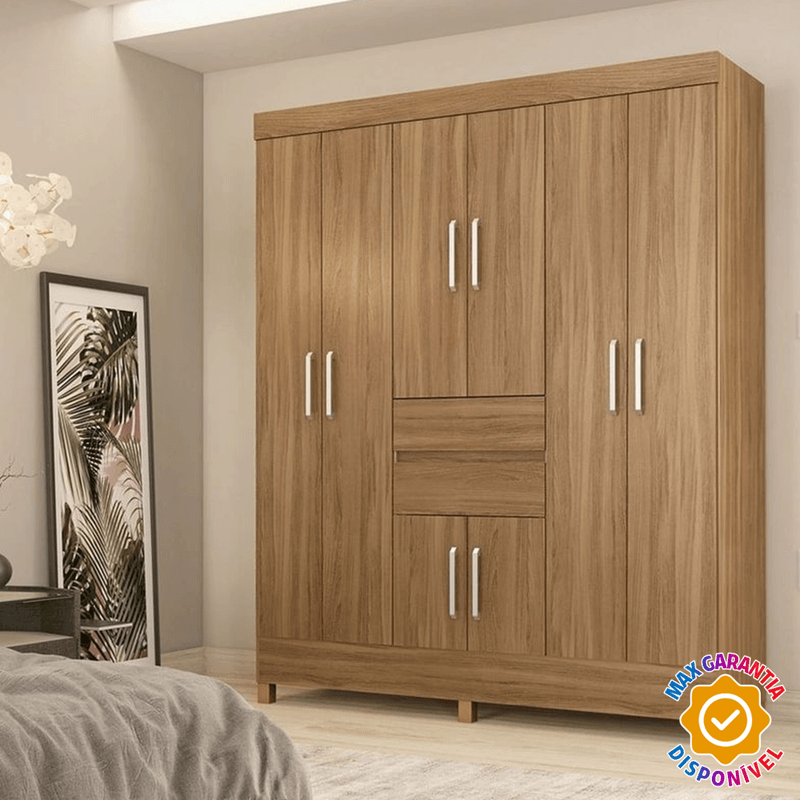 - 08 Portas de Giro: Amplo espaço para pendurar suas roupas em 02 cabideiros de madeira, com compartimentos adicionais para sapatos e prateleiras para organização.