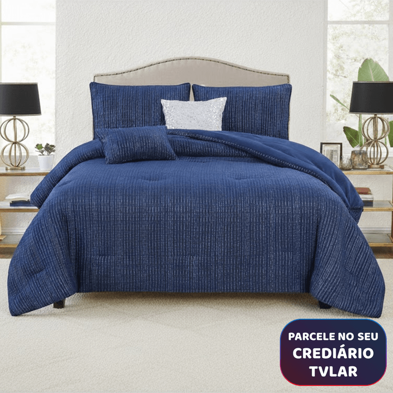 Kit Edredom King 5 Peças Microfibra Azul Marinho e Branco Liso