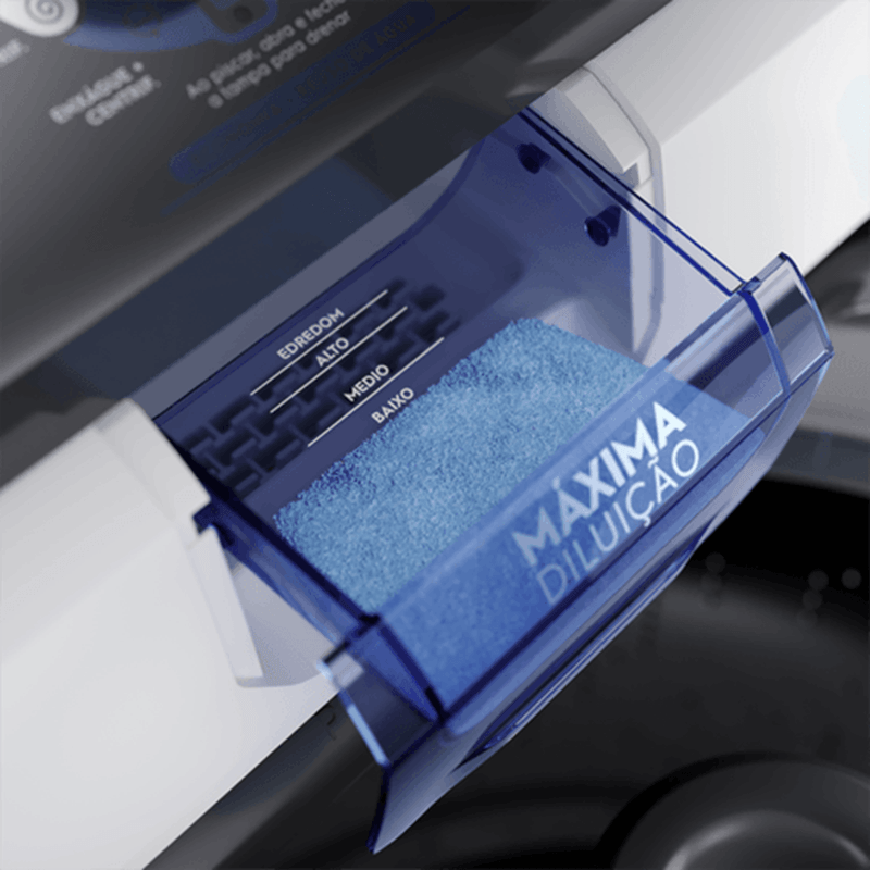 Dispenser Máxima Diluição: sabão 100% diluído, roupas sem manchas e gaveta sempre limpa.