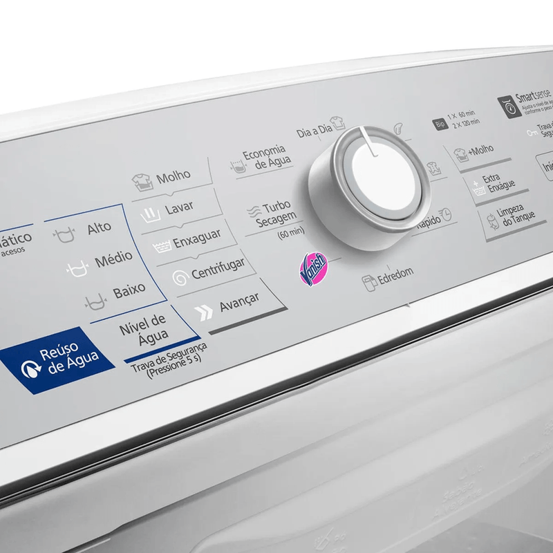 Smartsense, a máquina ajusta automaticamente o nível de água conforme o peso das roupas, garantindo economia e alta performance.