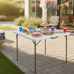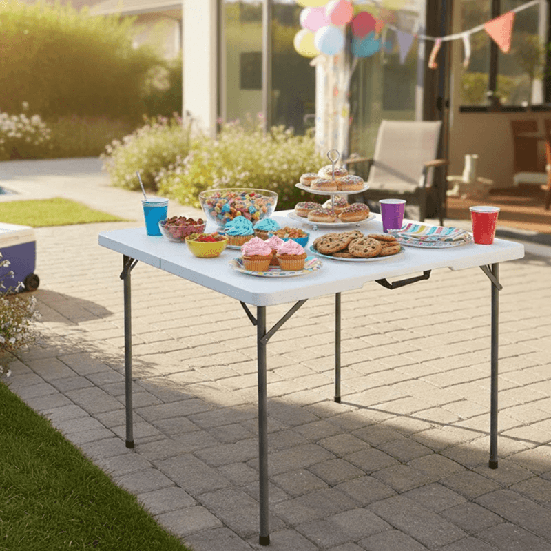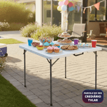 Mesa dobrável com estrutura resistente, fácil de transportar e armazenar, indicada para uso residencial, comercial, eventos e áreas internas ou externas.