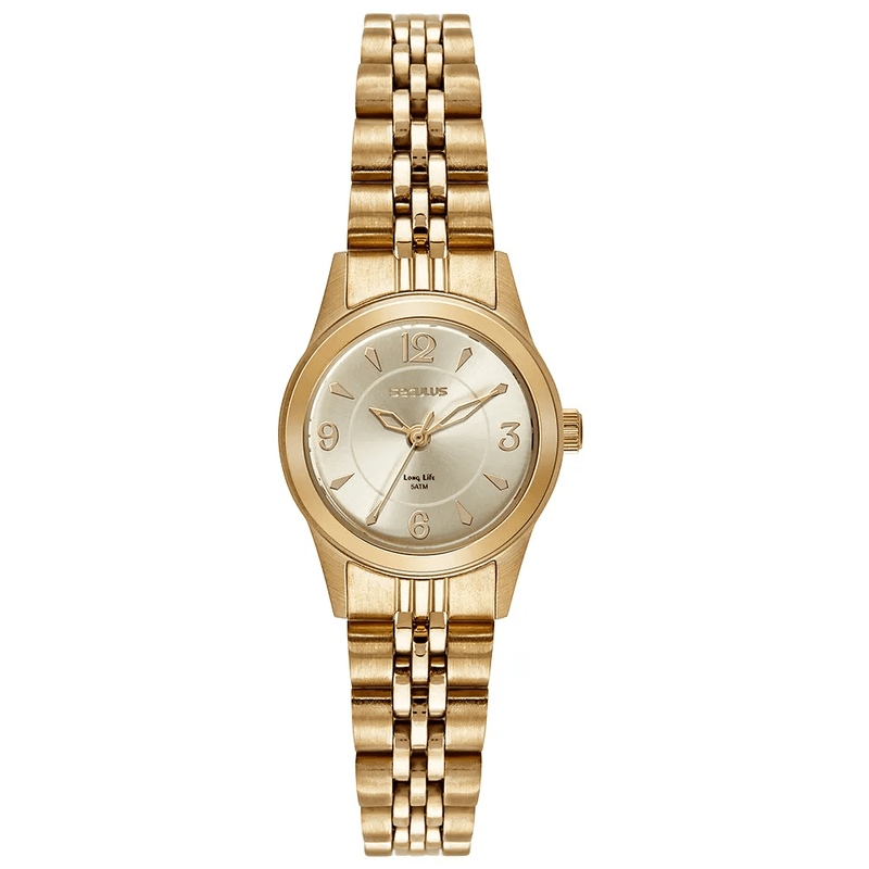 Clássico, elegante e atemporal, este relógio analógico feminino é perfeito para quem busca sofisticação com discrição. Produzido inteiramente em aço com acabamento dourado, possui caixa compacta de 2,5 cm que valoriza pulsos delicados. Sua pulseira em gomos completa o visual refinado, tornando-o ideal para uso diário ou ocasiões especiais.