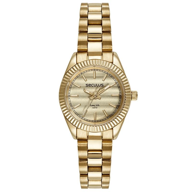Elegante e sofisticado, este relógio analógico feminino Seculus combina estilo atemporal com detalhes refinados. O mostrador champanhe com efeito diferenciado harmoniza com a folheação dourada, enquanto a catraca serrilhada adiciona um toque de sofisticação funcional. Ideal para uso casual ou diário, sua caixa compacta e pulseira em gomos proporcionam conforto e charme.