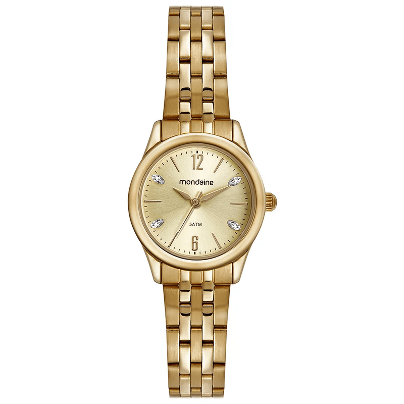 RELÓGIO FEMININO MONDAINE – ELEGÂNCIA E SOFISTICAÇÃO NO PULSO -  32587LPMVDE1Design Elegante Este relógio é o toque de sofisticação que faltava no seu visual. Com caixa redonda em metal e marcadores em cristais, traz um ar refinado e discreto. A pulseira em aço dourado escovado e polido oferece brilho na medida certa e excelente ajuste.