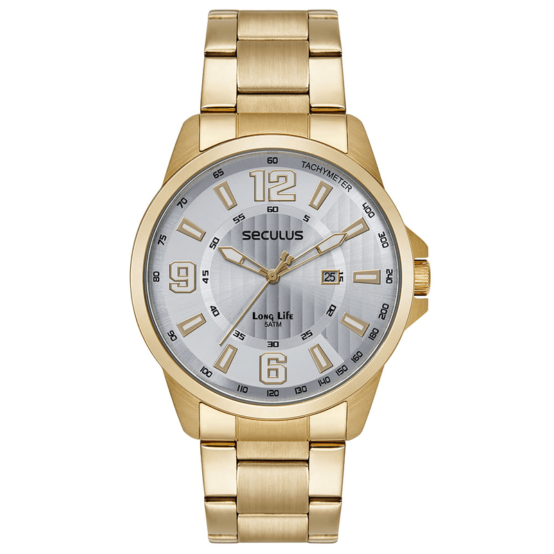 O Relógio Seculus Masculino Long Life 44219GPSVDA4 combina sofisticação e versatilidade. Com folheação dourada, mostrador prateado e marcadores geométricos, este relógio une design clássico e moderno, ideal para ocasiões sociais e uso diário.