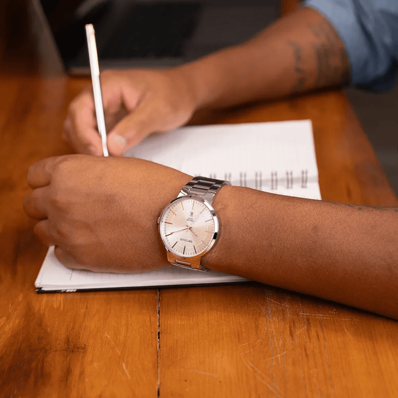 O Relógio Masculino Seculus 23730G0SVNA1 une elegância e sofisticação em um design moderno. Todo em aço inoxidável com acabamento cromado, possui mostrador texturizado e calendário integrado, oferecendo estilo e funcionalidade para o uso diário ou ocasiões formais.