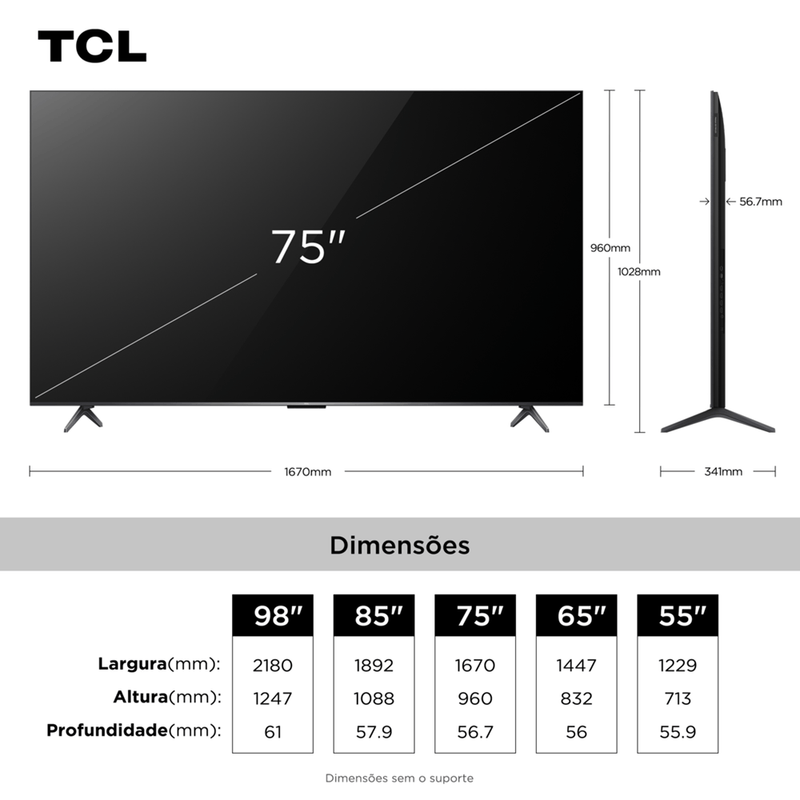 Design sem bordas, elegante e moderno, disponível em tamanhos de 55” a 98”, ideal para qualquer ambiente.