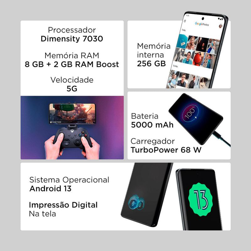 O processador MediaTek 7030, a conectividade Wi-Fi 6E e a velocidade 5G oferecem a potência necessária para experiências de última geração. Jogue games na nuvem de forma suave em qualquer lugar e desfrute das experiências sem fio do Moto Connect para levar a diversão para a TV e integrar perfeitamente o Android com PCs Windows.