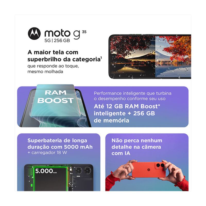 O Moto G35 5G combina inovação, desempenho e segurança para elevar sua experiência móvel a outro nível!