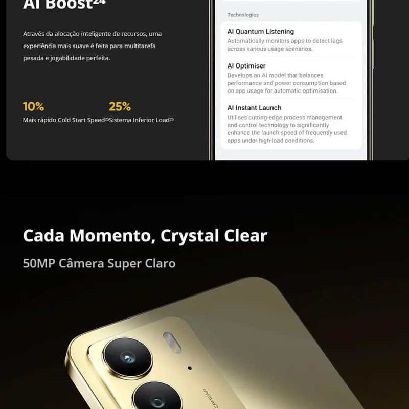Com o Smartphone Realme C75, você tem a combinação perfeita de resistência, durabilidade, desempenho e qualidade de imagem. Ideal para quem busca um aparelho completo e confiável para todas as aventuras.