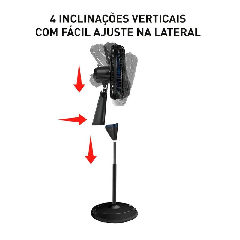 O Ventilador Arno X-treme 9 vem com dois suportes, permitindo seu uso tanto como ventilador de mesa quanto de coluna. Fácil de montar e desmontar, ele se adapta às suas necessidades em qualquer ambiente. Com inclinação ajustável por um botão lateral, você pode direcionar o vento exatamente para onde deseja, garantindo o máximo conforto.