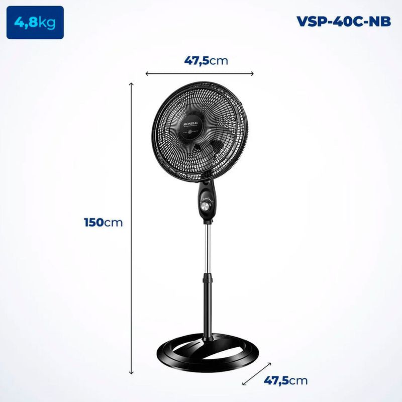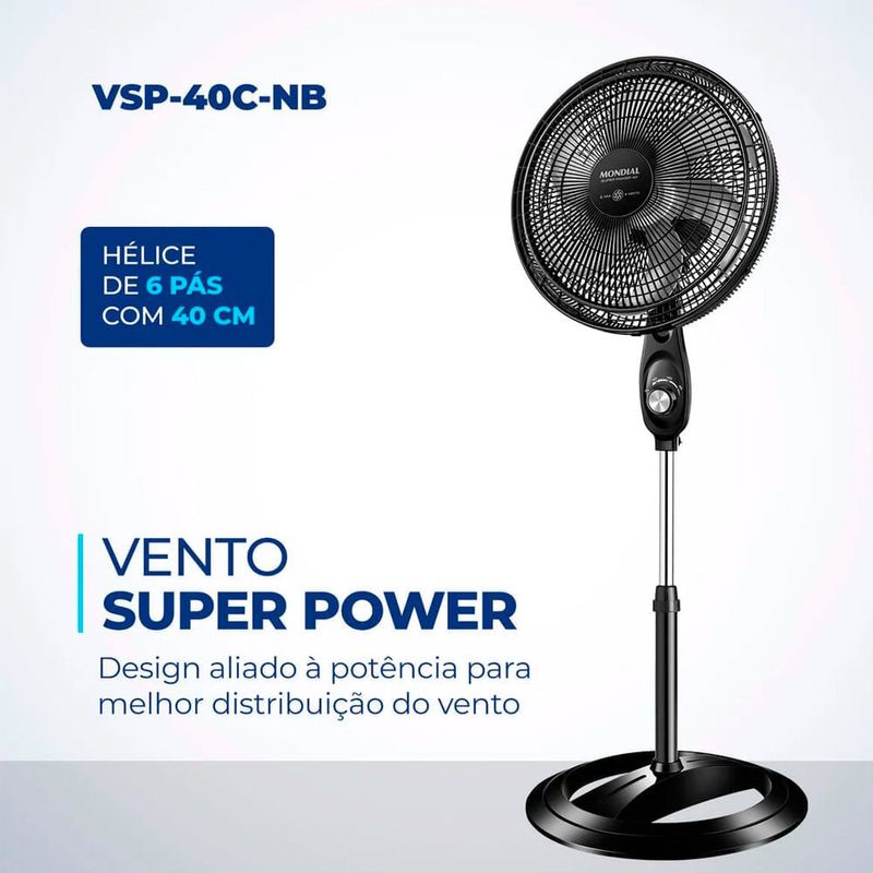 O Ventilador de Coluna Mondial Super Power 40cm VSP-40C-NB possui um diâmetro de 40 cm e hélice com 6 pás, garantindo um ambiente mais refrescante e agradável. O design aliado à potência promove maior intensidade do vento, proporcionando um ambiente fresco e confortável.